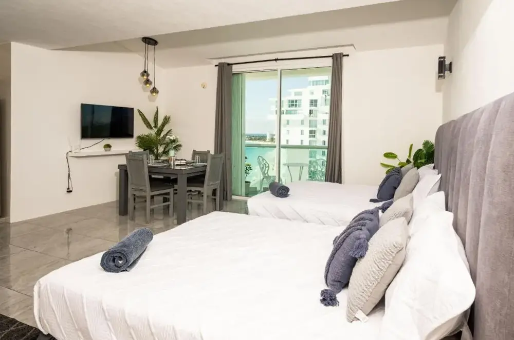 More information about Turquoise Reflection!Ocean Turtle Nest offers a tranquil retreat located at Km 19.5 Boulevard Kukulcan, 77500 Cancún, México. This accommodations features a private beach area and direct access to several nearby beaches including San Miguelito Beach just 2.5 km away and Playa Punta Nizuc within 1.1 km. Guests can enjoy two swimming pools, air conditioning, and complimentary parking.
